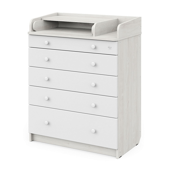 В Maks применяется столик для пеленания с простой и надежной системой раскладывания. Рядом с пеленальным столиком предусмотрено отделение для средств по уходу за ребенком. Комод весьма вместительный, включает пять ящиков, установленных на надежные шариковые направляющие с бесшумным ходом. Один из ящиков — нижний — имеет большую глубину, а верхний оснащен органайзером для более удобной сортировки детских вещей.