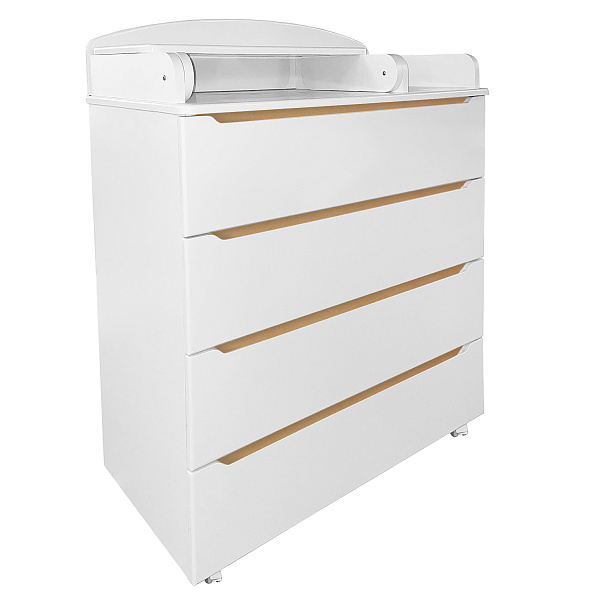 Комод Indigo Style 800/4 с узким пеленальным столиком и четырьмя вместительными выдвижными ящиками имеет стильный дизайн. Будет отлично смотреться в любой детской. Изготовлен в двух цветах – белом и белом с элементами натурального дерева.