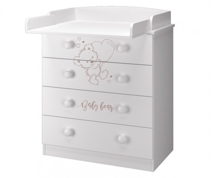 Покрытие экологичное. Четыре вместительных ящика выдвигаются бесшумно благодаря шариковым направляющим. У комода удобные круглые ручки, а на фасаде нанесено изображение медвежонка с сердечком.