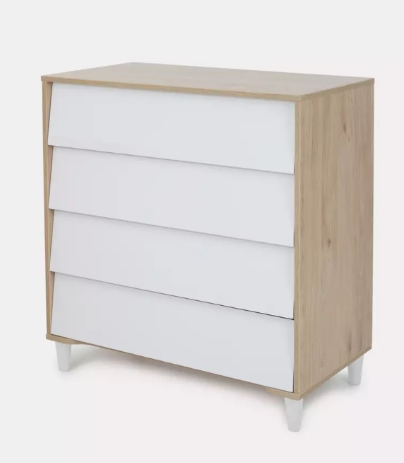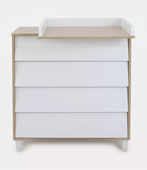 Изделие характеризуется эффектными наклонными фасадами, которые выгодно выделяют этот предмет мебели на фоне аналогичных комодов. В комоде имеется откидной бортик, который превращает изделие в полноценный пеленальный столик. Когда ребенок подрастет, бортик можно убрать, причем без следов от отверстий.