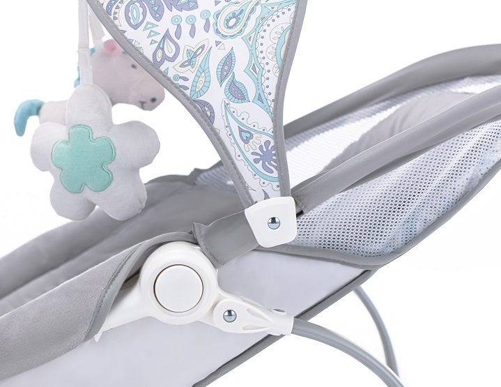 У шезлонга-качелей удобный козырек с закрепленными подвесными игрушками. Козырек защищает малыша от активных солнечных лучей. Приспособление очень легкое, работает от батареек. Благодаря надежному металлическому основанию качелями можно пользоваться на любой ровной поверхности. Сборка быстрая, ножки очень просто вынимаются из креплений сиденья.