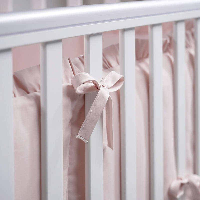 Все детали бортиков прикрепляются к кроватке с помощью надежно пришитых завязок. На концах завязок стоят закрепляющие швы, благодаря чему они не расходятся и прослужат долго. Также завязки добавляют бортикам нежного изящества.